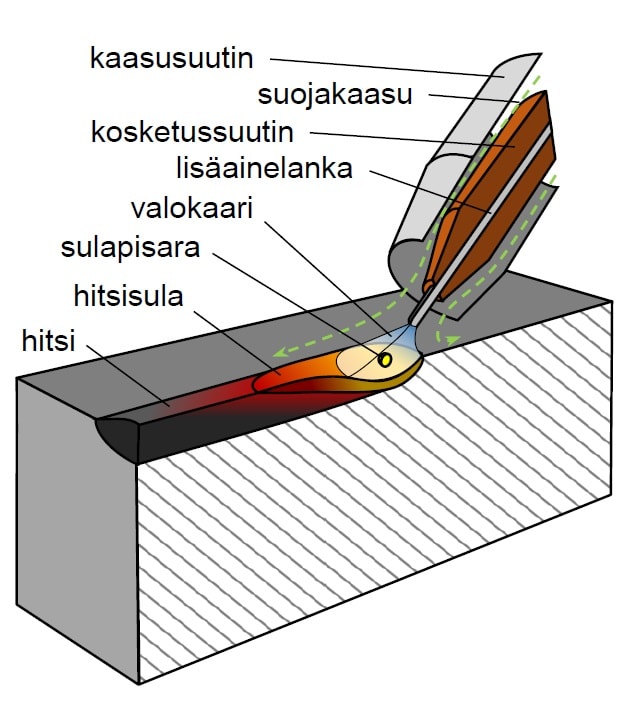 MIG/MAG-HITSAUS on varsin yleinen metallien hitsaukseen käytetty kaasukaarihitsausprosessi, jossa valokaari palaa metallisen lisäainelangan ja työkappaleen välillä. Langansyöttölaite syöttää lisäainelankaa tasaisella nopeudella hitsauspistoolin lävitse kohti työkappaletta, jolloin valokaaren lämpö sulattaa lisäainelangan kärjen, ja sula metalli siirtyy hitsisulaan pisaroina.