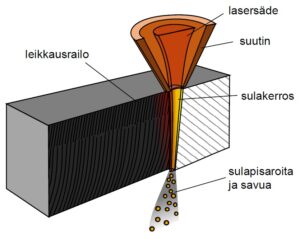 PROSESSIN PERIAATE on yksinkertainen. Lasersäde fokusoidaan leikkauspäässä sijaitsevalla linssillä pieneksi, tyypillisesti 0,1-0,4 mm halkaisijaltaan olevaksi pisteeksi työkappaleen pinnalle tai hieman pinnan ylä- tai alapuolelle. Fokuspisteen suuri energiatiheys (yli 105 W/mm2) saa aikaan materiaalin nopean kuumenemisen. Materiaali sulaa ja/tai höyrystyy, ja sula/höyrystynyt materiaali puhalletaan pois syntyneestä leikkausrailosta lasersäteen kanssa koaksiaalisen leikkauskaasuvirtauksen avulla. Liikuttamalla työkappaletta tai leikkauspäätä saadaan aikaan halutun muotoinen leikkausrailo.