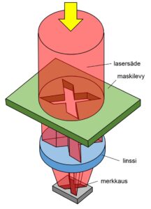 ERILAISIA OPTIIKOITA käytetään merkattavan muodon aikaansaamiseksi työkappaleen pinnalle. Kaksi yleisintä optiikkatyyppiä lasermerkkauksessa ovat skannerioptiikka sekä maskioptiikka.