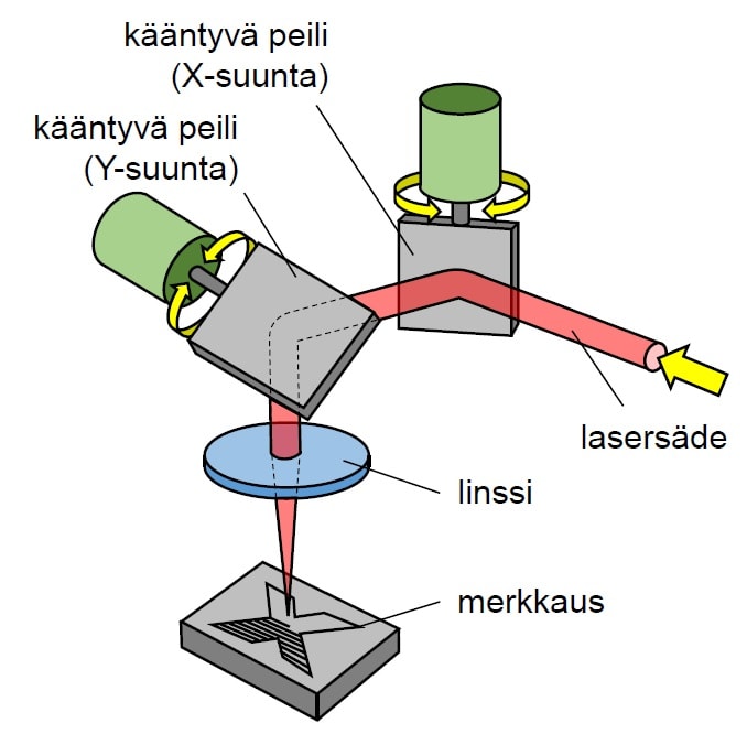 SKANNERIOPTIIKKA perustuu yhteen tai kahteen galvanometrisesti ohjattuun kääntyvään peiliin, jotka poikkeuttavat lasersädettä X- ja Y-suunnissa ja ohjaavat näin lasersädettä työkappaleen pinnalla useiden metrien sekuntivauhtia. Toinen nimitys menetelmälle on vektorimerkkaus, sillä merkattavat muodot muodostuvat useista yksittäisistä viivoista. Jokainen laserpulssi saa aikaan pienen pisteen työkappaleen pinnalle, ja limittämällä näitä pieniä pisteitä saadaan aikaan viivoja sekä kokonaisia alueita. Joustavuutensa ansiosta skannerioptiikka on optimaalinen työkalu esimerkiksi grafiikan, muuttuvien numerosarjojen ja erilaisten viivakoodien merkkaukseen.