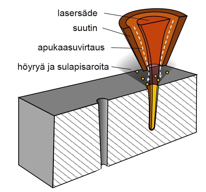 APUKAASUN ensisijainen tehtävä on auttaa sulaneen ja höyrystyneen materiaalin poistumista poratusta reiästä. Lisäksi happea sisältävällä apukaasulla voidaan tehostaa prosessia monien metallien kohdalla eksotermisen reaktion tuoman lisäenergian ansiosta. Hapen lisäksi käytettyjä apukaasuja ovat mm. paineilma ja typpi. Laserporausta voidaan tehdä myös ilman apukaasua, mutta tällöin työstöoptiikan suojaaminen höyryiltä ja roiskeilta on järjestettävä muilla keinoilla.