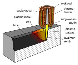 PLASMAHITSAUKSEN JAOTTELU voidaan tehdä toimintaperiaatteen perusteella sulattavaan plasmahitsaukseen ja lävistävään plasmahitsaukseen. Sulattava plasmahitsaus muistuttaa hyvin paljon TIG-hitsausta, kun taas lävistävässä plasmahitsauksessa materiaaliin muodostuu reikä plasmapatsaan porautuessa sulaan metalliin suuren termisen ja kineettisen energiansa vaikutuksesta.  Syntyneen reiän, josta käytetään tyypillisesti nimeä avaimenreikä tai lävistysreikä, halkaisija on tyypillisesti 1,5-3 mm riippuen aineenpaksuudesta ja polttimesta. Kun poltinta kuljetetaan eteenpäin, plasmapatsaan sulattama metalli virtaan sen sivuilta reiän taakse yhtenäiseksi sulaksi ja jähmettyy edelleen hitsiksi. Sulattava plasmahitsaus soveltuu tyypillisesti alle 3 mm ainevahvuuksille ja lävistävä plasmahitsaus ainevahvuuksille 3-12 mm.